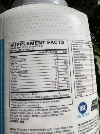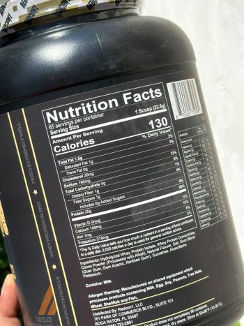 - 24گرم پروتئین ترکیبی متشکل از ایزوله پروتئین آب پنیر، کنسانتره پروتئین آب پنیر و پپتیدهای آب پنیر برای حمایت از توده عضلانی بدون چربی