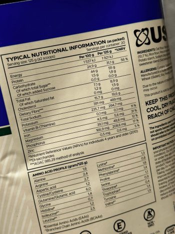 - 50 گرم پروتئین، 1350 گرم کالری، 11 گرم BCAA، 23 گرم EAA