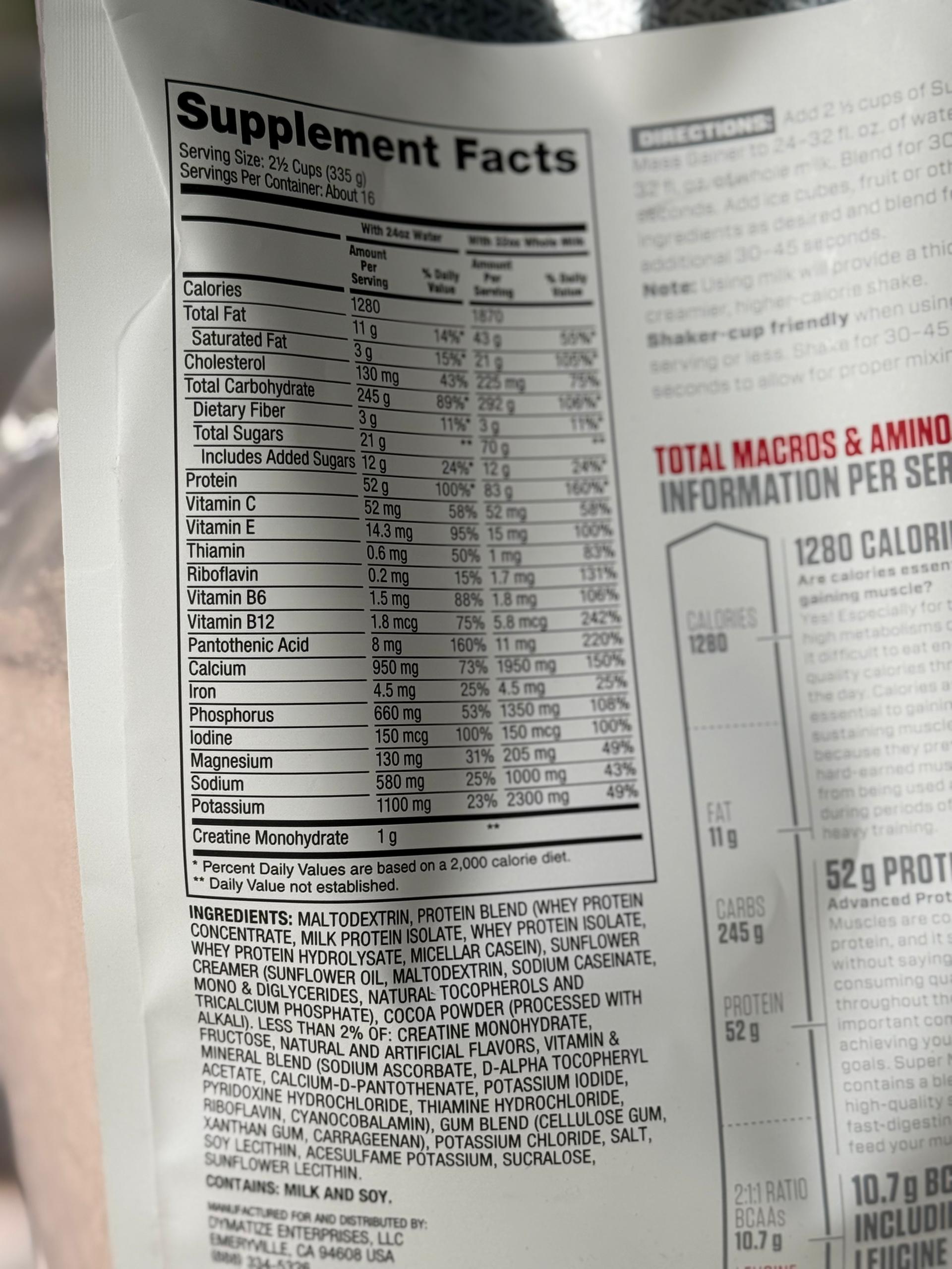 - این محصول حاوی 50 گرم پروتئین با جذب سریع و آهسته و 250 گرم کربوهیدرات است تا به راحتی 1250 کالری دریافت کند